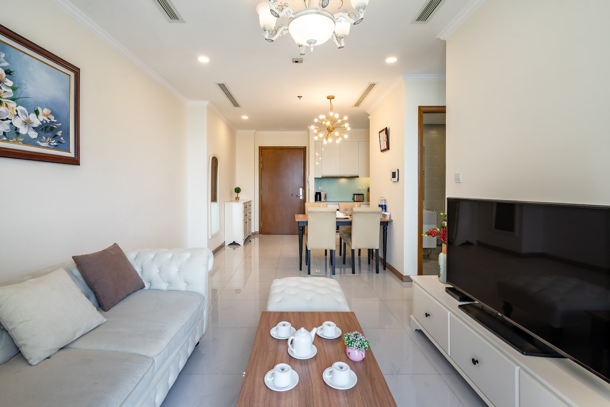 Landmark 1 Apartment – Erstklassiges Wohnen direkt neben Landmark 81 Willkommen im hochwertigen Wohnraum im Landmark 1, der sich neben dem ikonischen Gebäude des Landmark 81 befindet ✨ Informationen zur Wohnung: 2 Schlafzimmer, 2 WC, geräumiger Balkon für Wind und natürliches Licht. 100 % neue Möbel, modernes Design mit kleiner Bar, Kunstleuchter und auffällige Farben, die einen persönlichen Höhepunkt für den Raum schaffen. Ausgestattet mit hochwertigen Matratzenkissen, Drap-Decken nach 5-Sterne-Hotel-Standards, die ein Gefühl der absoluten Entspannung bieten.