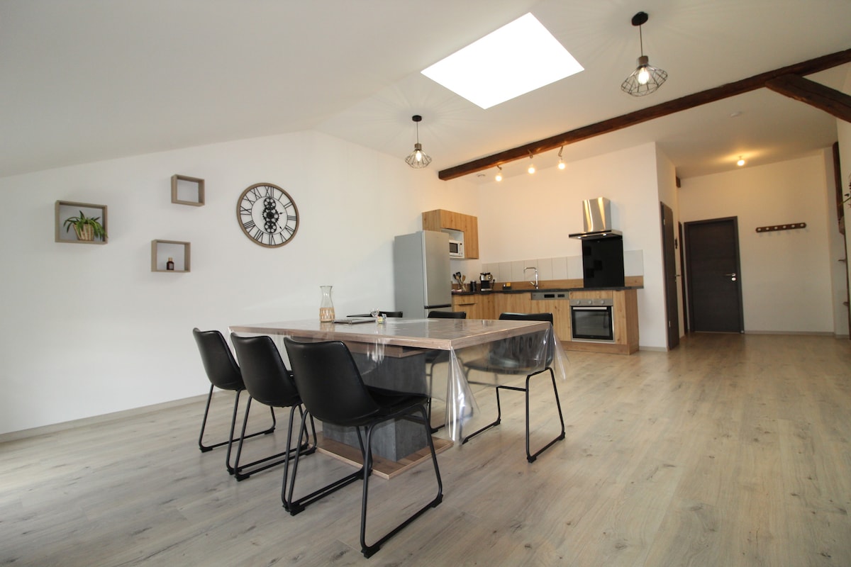Passez de bons moments dans ce logement paisible. Appartement refait à neuf situé dans une maison, avec une chambre équipée d'un lit de 160x200 et un salon avec un canapé convertible en lit 140x190 avec un vrai matelas. Cuisine séparée, équipée et coin repas. Salle de bain avec WC séparés, une machine lavante séchante à disposition. Idéal pour les déplacements professionnels ainsi que pour un séjour en famille. Livres et jeux de société à disposition.