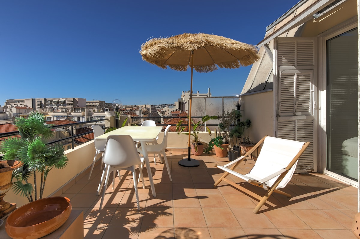 A newly furnished and renovated apartment, on the 5:th and top floor, situated in Nice high end shopping district. Wonderful and calm 12 sqm terrace, with access from all rooms. Open plan kitchen, dining & living room. Fully fitted kitchen. Bedroom with King size bed. Bathroom & toilet renovated 2020. Modern & gated building with lift. A/C, Wifi & TV. 5 minutes walk to the beach & Place Massena. Direct tram from the airport to the city (stop Jean Médecin) two blocks from the apartment.