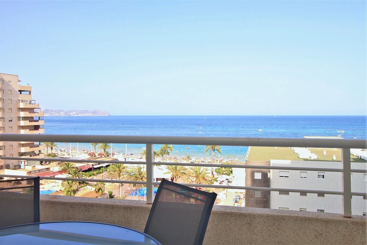 Apartamento de 2 habitaciones para 4 personas en primera línea de la playa Poniente, con vistas de la playa y el mar, terraza grande con vistas, todo exterior, salon amplio con vistas al mar, aparcamiento privado, wifi, TV, aire acondicionado, cocina completa (lavavajillas, lavadora, horno), baño completo, en urbanización con piscina, jardín muy bonito con vistas al mar y pista de tenis. La urbanización tiene acceso directo al paseo maritimo y es una de las más bonitas de la playa de Poniente.