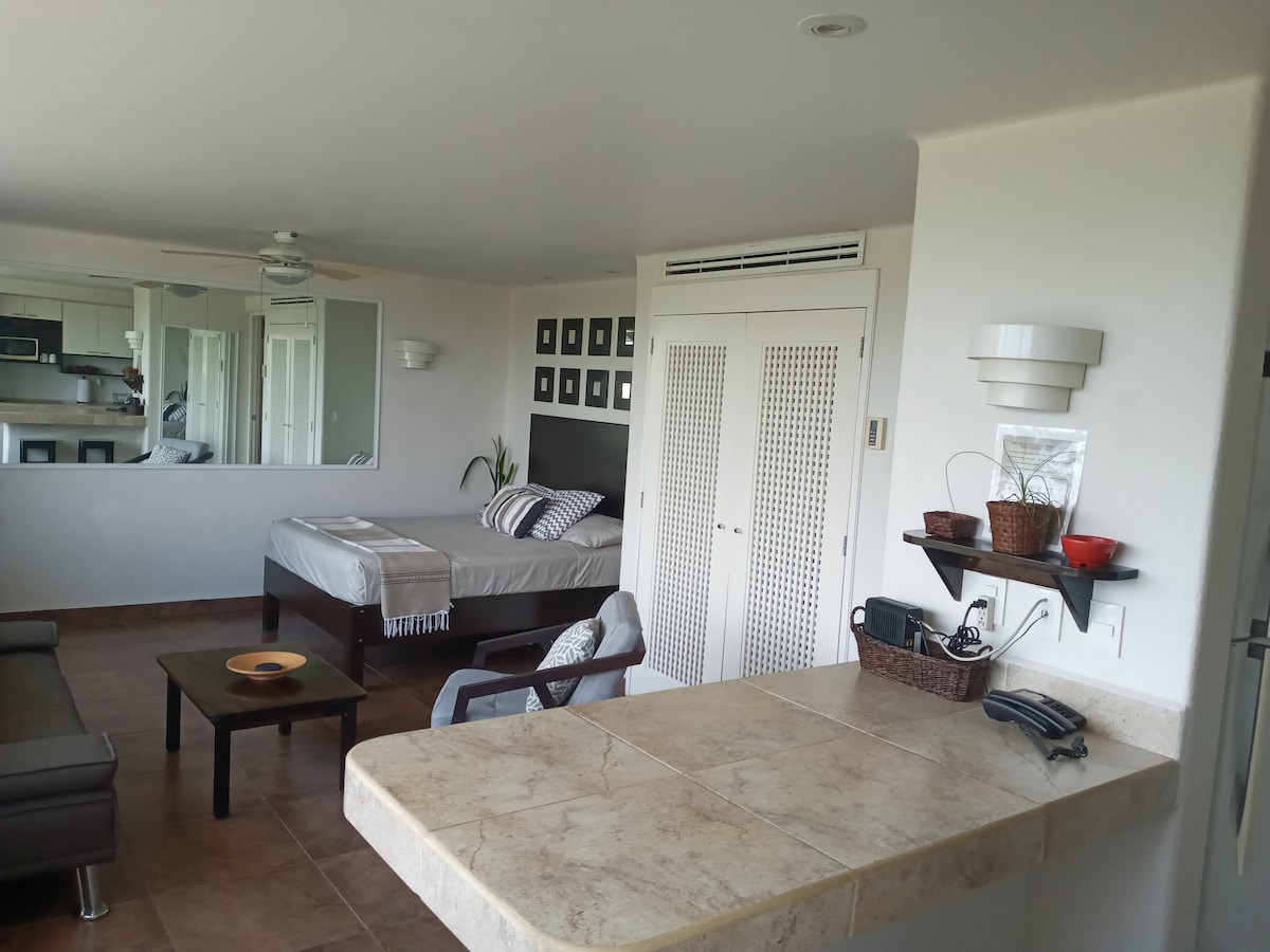 Willkommen in unserem gemütlichen Studio in Zihuatanejo! Dieser helle Raum verfügt über ein Kingsize-Bett, ein komplettes Badezimmer und eine gut ausgestattete Küchenzeile. Genieße morgens Kaffee oder Sonnenuntergänge vom privaten Balkon mit Blick auf die wunderschöne Bucht von Zihuatanejo. Tauche ein in den Infinity-Pool, schlendere zum nahe gelegenen Playa La Ropa, nur einen kurzen Spaziergang entfernt. Perfekt für Paare oder Alleinreisende, die sich entspannen und die Gegend erkunden möchten. Buche deinen Aufenthalt und erlebe das Paradies! Kleine Hunde willkommen: Hunde unter 20 Pfund willkommen!