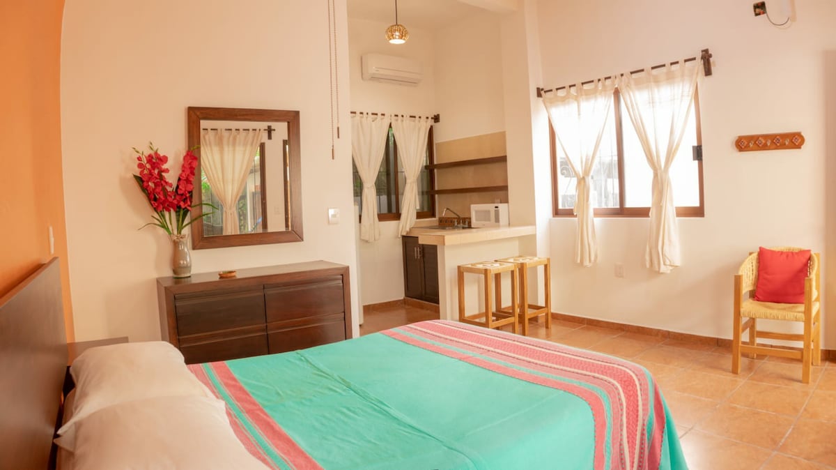 Genieße nach einem langen Tag in der Sonne etwas Ruhe in diesem gemütlichen Zimmer. Doppelbett für eine oder zwei Personen, Klimaanlage, Ventilator, TV und dein eigenes Bad. All dies inmitten kleiner Wege, in der Nähe des Pools, den du mit unseren anderen Gästen teilst, im Schatten von Neems, der Hängematte nur wenige Schritte vom Meer entfernt und nur 60 Meter die Straße hinunter, wo du deine Zehen im Sand verstecken und entspannen kannst. Oder surfe! Mache es zu DEINEM Abenteuer.