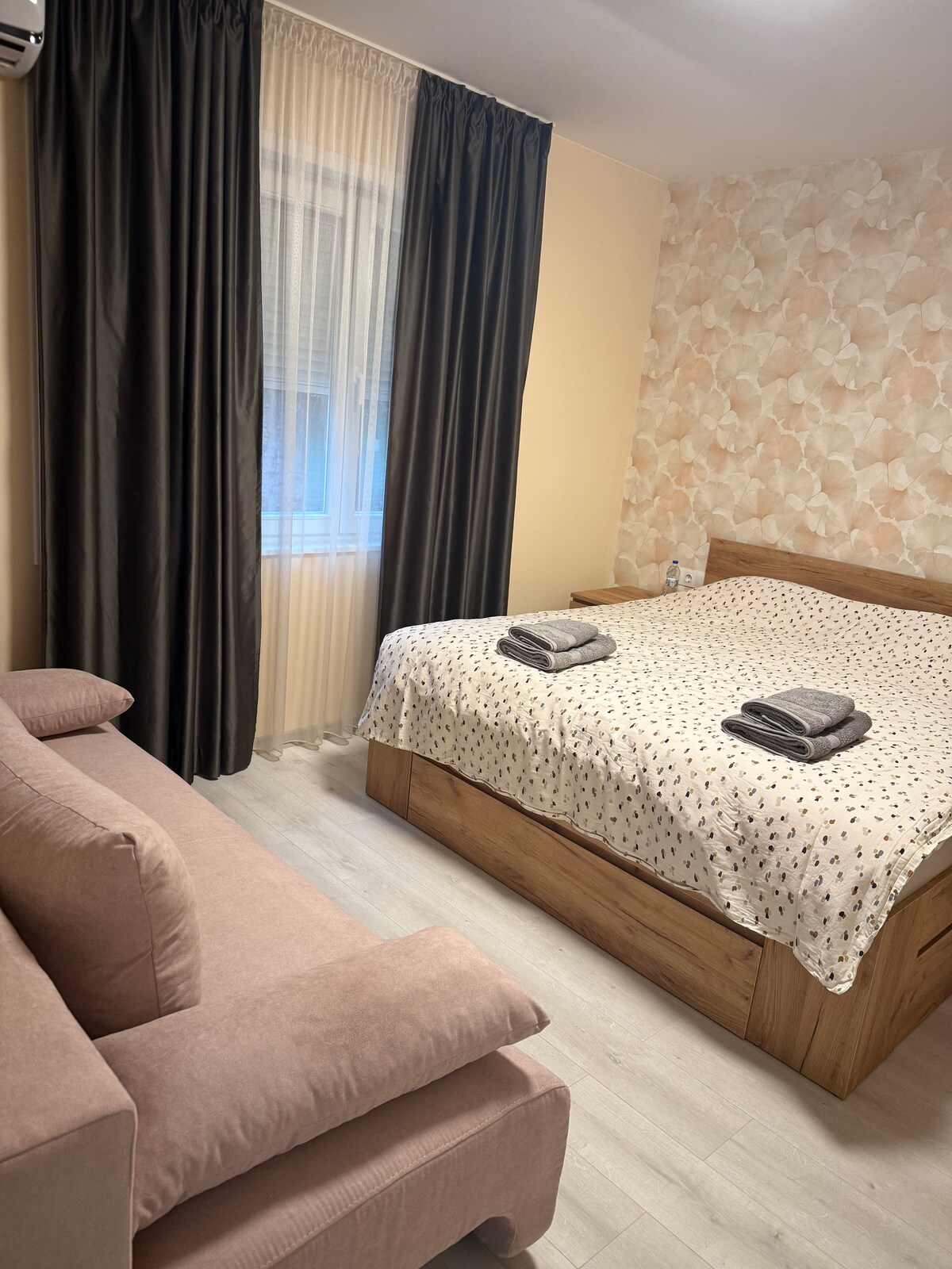 Das Studio befindet sich im breiten Stadtzentrum von Pleven. Es ist ein Bodenversorgungsunternehmen mit Wohnzimmer ,Küchenzeile und Badezimmer mit WC,kann auch vom Schuppen mit dem Grill genossen werden, der sich im Innenhof des Hauses befindet. Es befindet sich in unmittelbarer Nähe des Maira-Supermarktes LiFe i restaurant life (20 m vom Studio entfernt). Es gibt auch Apotheken,Casa of Izzy pei , Trolley-Haltestellen ,Taxis . Das Studio verfügt über ein Sofa, ein Schlafzimmer 200/160 und wird mit Fußbodenheizung beheizt.