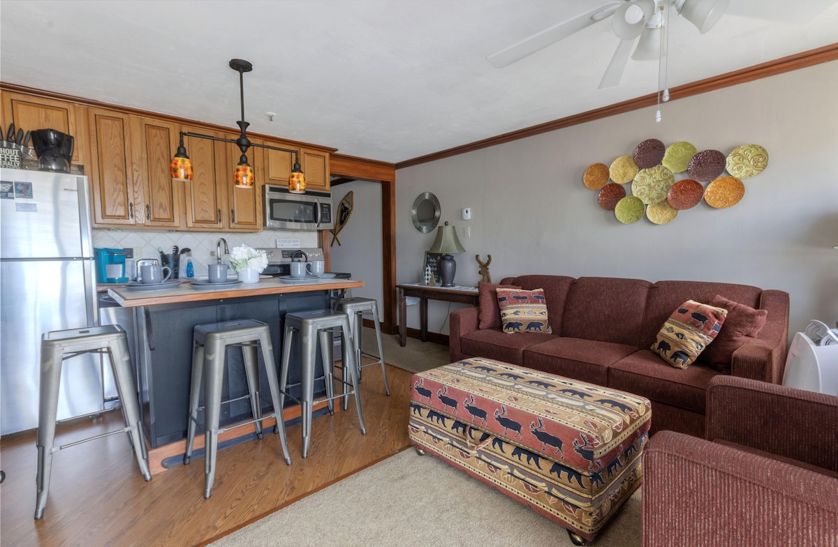 Bleibe im Dorf und fahre mit dem Fahrrad zur Terrasse und wieder weg. Suchen Sie nicht weiter, es gibt nur 2 Einheiten im Dorf, die diesen Vorteil bieten. Unseres ist eines der beiden. Komplett aktualisierte Wohnung im 1. Stock mit einem privaten Schlafzimmer. Vollständig kontaktloser Check-in, umgehen Sie die Check-in-Schlangen und gehen Sie direkt zur Unterkunft. Neu für die Wintersaison 2025-2026 - Wir haben unsere Bodenbeläge und Wohnzimmermöbel aufgewertet! Brandneues Schlafsofa und Entspannungssessel, hellerer Holzboden! *Einige Bilder können ältere Böden und Möbel zeigen