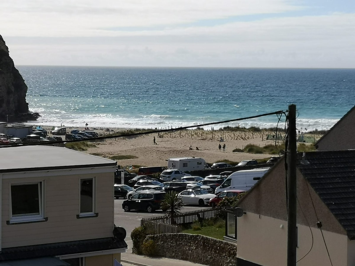 Ein gemütliches und helles kornisches Haus, zwei Gehminuten vom Strand entfernt und mit fantastischer Aussicht! Ein großes, bequemes Sofa und ein 75-Zoll-Fernseher mit Surround-Sound sind der perfekte Ort, um es sich gemütlich zu machen und zu entspannen! Mit superschnellem StarLink-Internet und einem Ort zum Trocknen deiner Neoprenanzüge bist du bereit zum Chillen, Arbeiten oder Spielen! Genieße ein Bad, Surfen oder wandere auf dem Küstenweg und auf dem Land ... und finde leckeres Essen und Getränke in den lokalen Pubs und Restaurants.