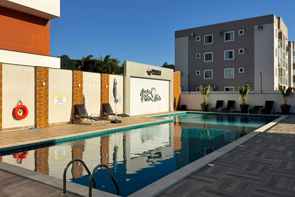 Wohnung in Porto Belo mit Pool. Sie verfügt über 2 Schlafzimmer, ein großes Wohnzimmer, das in die Küche integriert ist, einen privaten Grill und einen Balkon, um sich zu entspannen und die Landschaft zu genießen. In der Nähe von Märkten, Restaurants, Sehenswürdigkeiten und einer 6-minütigen Fahrt zum Strand.