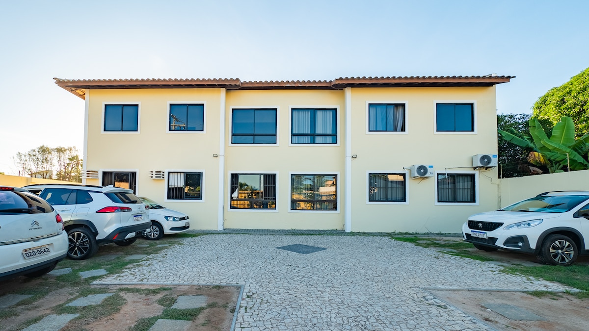 Haus in einer Eigentumswohnung mit Blick auf das Wasser mit Infrastruktur für Sport. Unterkunft am Strand mit einem vollen Blick aufs Meer. Ideal zum Ausruhen und Arbeiten aus der Ferne, 500 Mega WLAN. 1/4 mit Klimaanlage, Bett- und Badewäsche, Wohnzimmer mit Schlafsofa, Swimmingpool, private Garage. Fühle dich willkommen und umarmt von der unglaublichen Erfahrung dieses ruhigen und gut gelegenen Ortes, am Meer und in der Nähe von Märkten, Apotheken, Restaurants, Fitnessraum, 10 Minuten vom Flughafen und 25 Minuten vom Busbahnhof entfernt. Willkommen