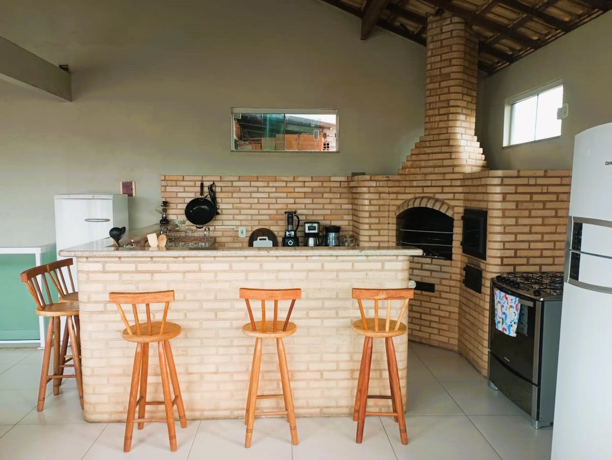 Wunderbares Haus, in der Nähe von Praia do Forte, mit absolutem Komfort. Bestehend aus Schlafzimmer, Wohnzimmer, Badezimmer und Balkon mit Blick auf den Garten. - WLAN mit mehr als 100 Mbs. - Zimmer mit Doppelbett und Etagenbett (zwei Einzelbetten) Deckenventilator, Smart-TV, Globo Play Streaming, Bettwäsche und Kissen. - Zimmer mit Stühlen und Poof. - Küche mit Geschirr. - Badezimmer mit elektrischer Dusche und Handtüchern. - Balkon mit Sofa und Hängematten. - Hinterhof mit Grill, Dusche und Bad.