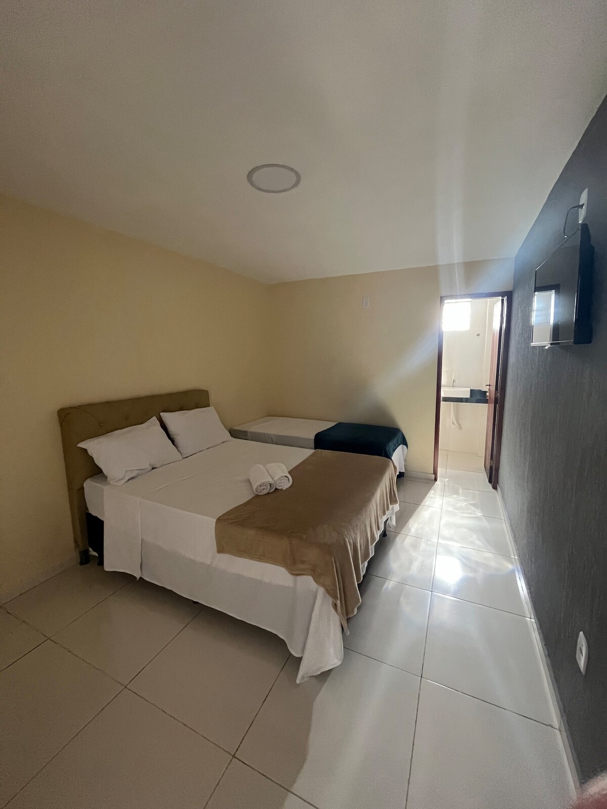 Suíte para 3 pessoas, café incluso, televisão, ar split, Wifi e banheiro privativo com chuveiro elétrico. Gratuito para 1 criança de até 5 anos. Aceitamos PET. Estacionamento interno disponível. Oferecemos roupas de cama, lençóis, travesseiros, sabonetes etc. OBS: As fotos são ilustrativas da categoria. A pousada poderá acomodá-lo em qualquer unidade desta categoria, conforme disponibilidade.