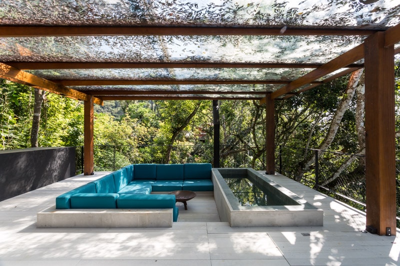Terrasse Gaia Prumirim mit Blick auf das Meer und den Wasserfall