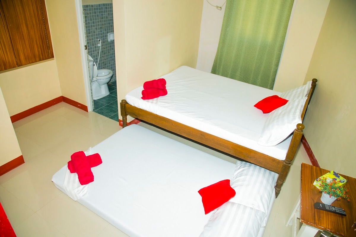 Our 'Family' room is on 2nd floor of our hotel. It has 4 sets of bunk beds (double deckers as they get called here) as well as its own bathroom. Its only two minutes walk to the beach where there are showers, CR and non motorised watersports.