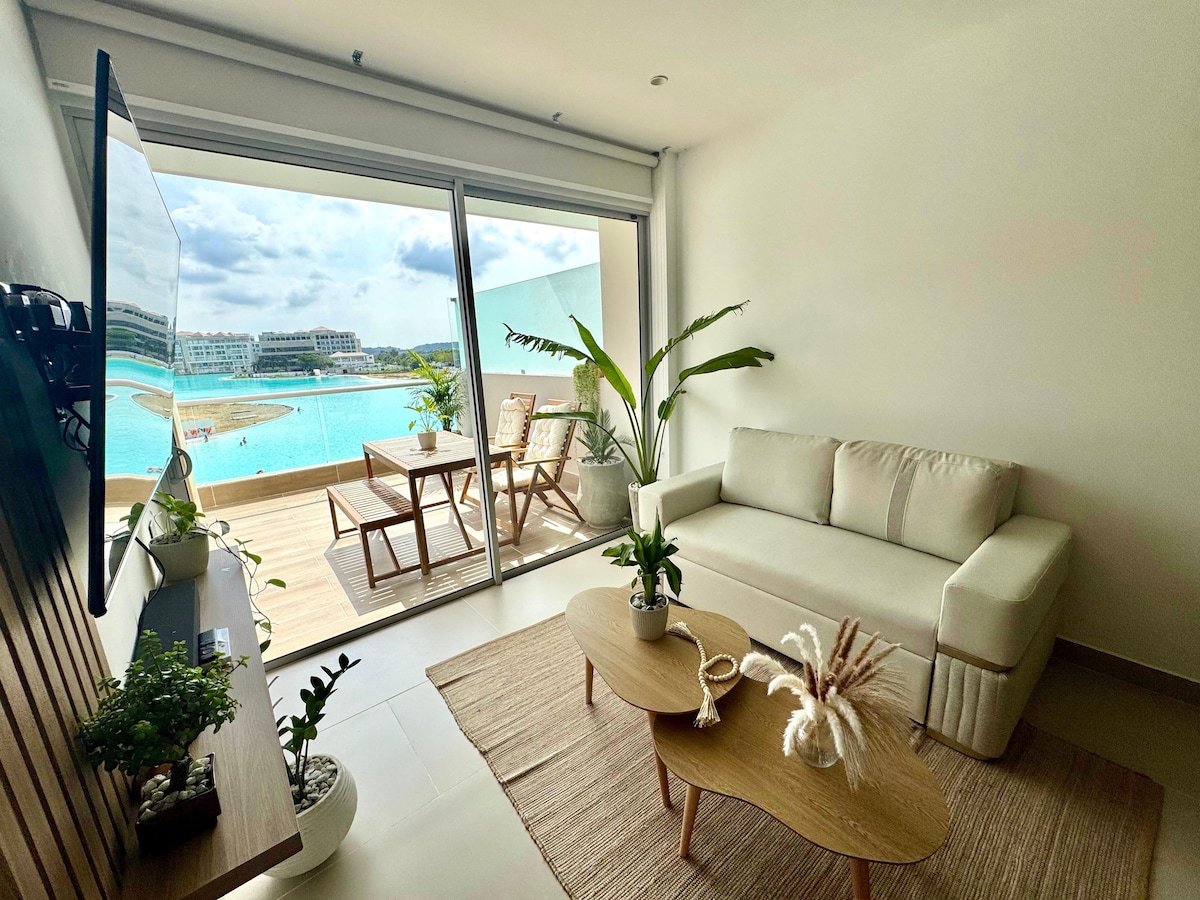 Luxus-Wohnung in Cartagena in der ersten Kristal Lagoons von Kolumbien, Paradies mit kristallklarem Wasser und weißem Sandstrand in der Wohnanlage Baia Krystal mit außergewöhnlichem Blick auf die Lagune, genießen Sie den künstlichen Strand mit Süßwasser und Wassersport, Whirlpool, Türkisch, Sauna, Fitnessraum, Kindergarten, Veranstaltungssaal und die besten und komfortabelsten Annehmlichkeiten der Gegend. 5 Minuten von den Stränden von Manzanillo mit dem Auto, 10 Minuten vom Flughafen und 15 Minuten vom historischen Zentrum entfernt