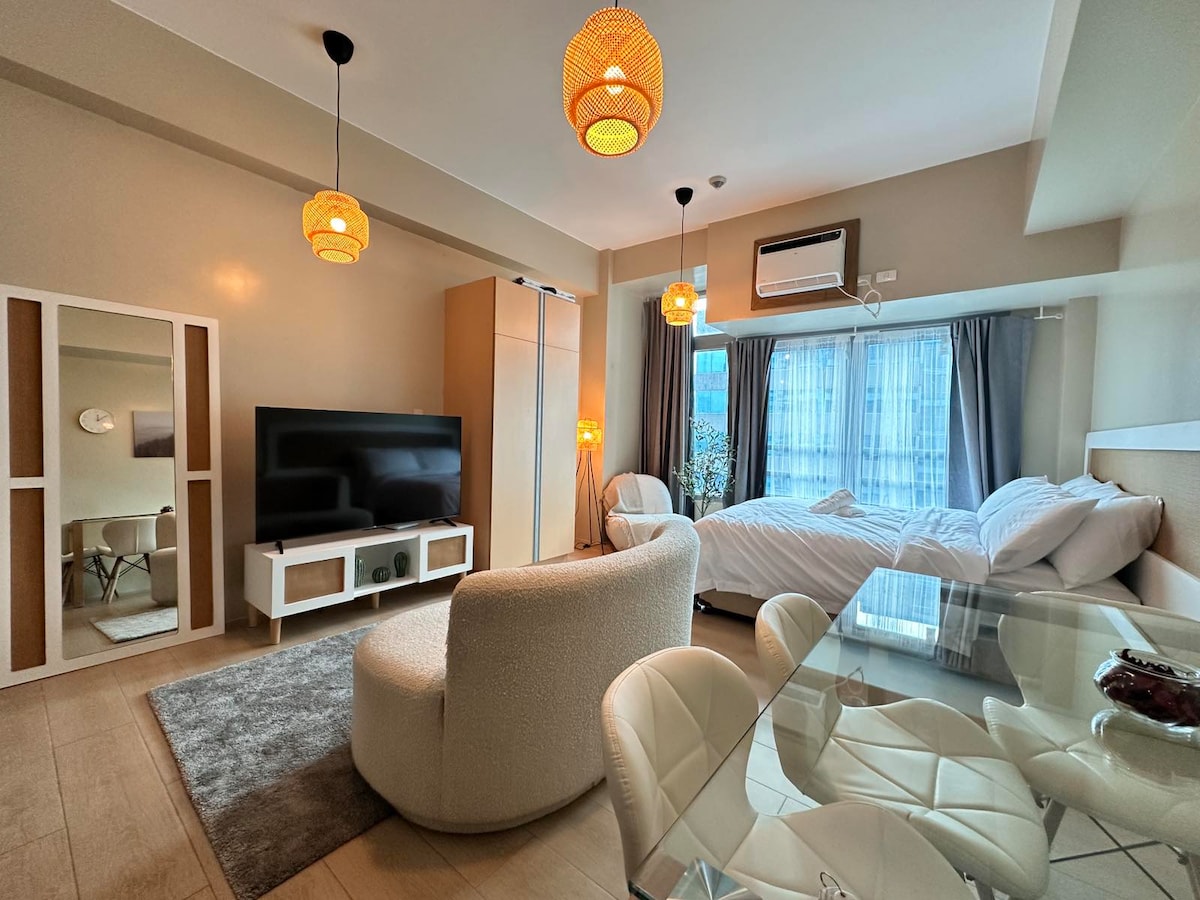 Escape to a high-floor suite with breathtaking BGC skyline views, cinematic JBL surround sound, and a 55-inch Full 4K Smart TV with LED mood lighting—your ultimate movie night haven. Take in the scenery with high-grade binoculars, then sink into the ultra-comfy Emma® Cloud-Bed for a perfect night’s sleep. Far from city noise yet close to everything, enjoy fast WiFi, Netflix, Disney+ and more! Truly a fully equipped space for a seamless, unforgettable staycation experience with Cinema 27!