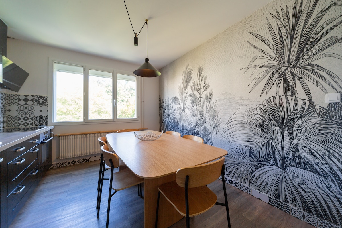 A Villefranche sur Saône, dans une résidence d'Architecte, venez découvrir la Calade et le Beaujolais. Situé en plein cœur de ville, vue sur un parc arboré, environnement calme, apaisé et sécurisé Appartement très ensoleillé, traversant sud nord situé au 2nd étage (sans ascenseur), grand balcon, stationnement en sous sol. 3 ch dont 2 ch équipées de lits queen size et 1 ch avec lits superposés. Cuisine ouverte sur le séjour convivial et lumineux.
