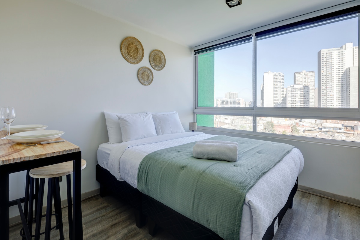 Modern studio apartment in Barrio Yungay, with wifi and air conditioning. Close to Cumming metro station, with quick access to Plaza de Armas, Barrio Italia, and Costanera Center. Building includes gym, laundry, and swimming pool (available during summer season, December to March). Surrounded by cafes, restaurants, and culture. Ideal for a comfortable, practical, and well-connected stay in Santiago. Book now!