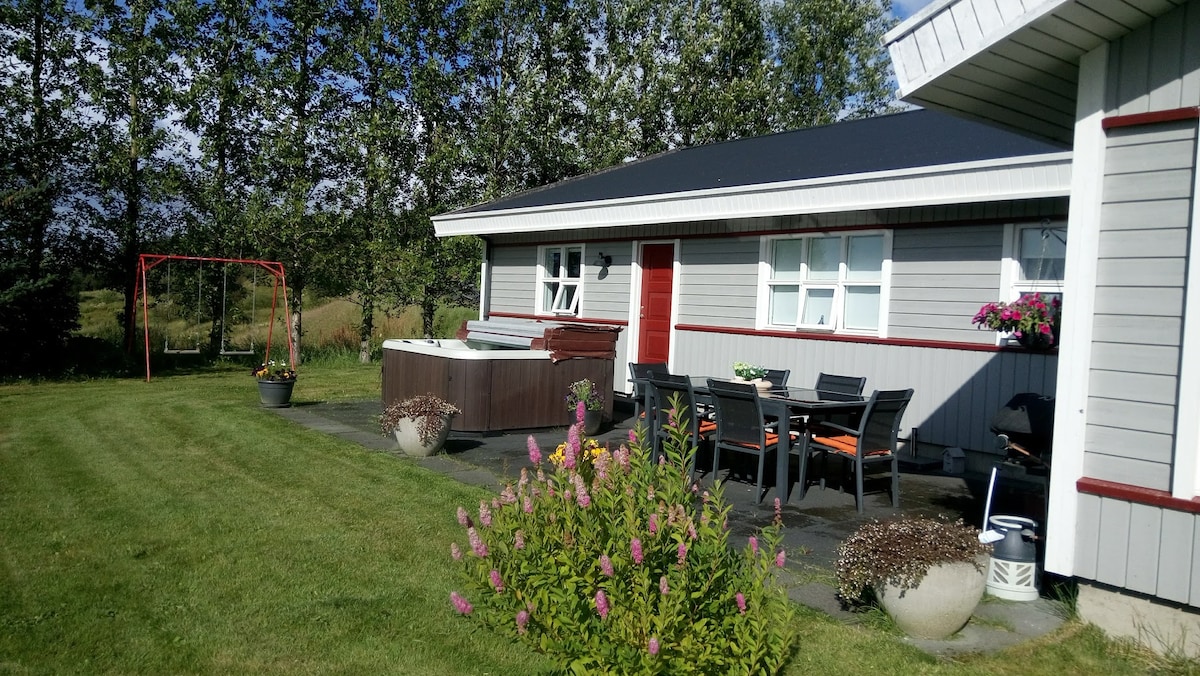 Das Ferienhaus ist sehr gemütlich und verfügt über eine Fußbodenheizung. Es können bis zu 7 Personen übernachten. Die Küche ist mit modernem Geschirr und allen notwendigen Dingen zum Kochen ausgestattet. Außerhalb des Wohnzimmers befindet sich eine Terrasse, auf der die Aussicht atemberaubend ist und im Winter besteht eine gute Chance, erstaunliche Nordlichter zu erleben! Es gibt kostenloses WLAN im Ferienhaus. Reiten ist mit persönlichem Service möglich.