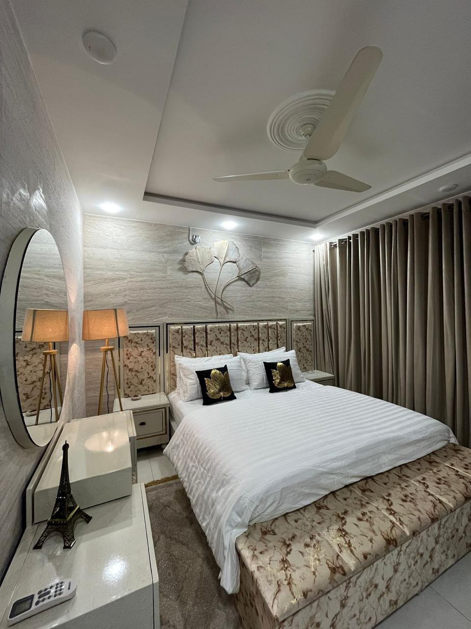 Erlebe luxuriöses Wohnen in dieser stilvollen 2-Zimmer-Wohnung in Bahria Town Rawalpindi mit Kingsize-Betten, einem 65-Zoll-Smart-TV mit Netflix, Highspeed-WLAN, Klimaanlage und heißem/kaltem Wasser. Genieße einen atemberaubenden Blick auf den Eiffelturm von 3 privaten Balkonen. Ideal für Familien und Geschäftsreisende, mit Sicherheit rund um die Uhr, einem engagierten Housekeeping-Team und einer ruhigen, gehobenen Nachbarschaft. Buche jetzt und freue dich auf Komfort, Bequemlichkeit und unübertroffene Gastfreundschaft.