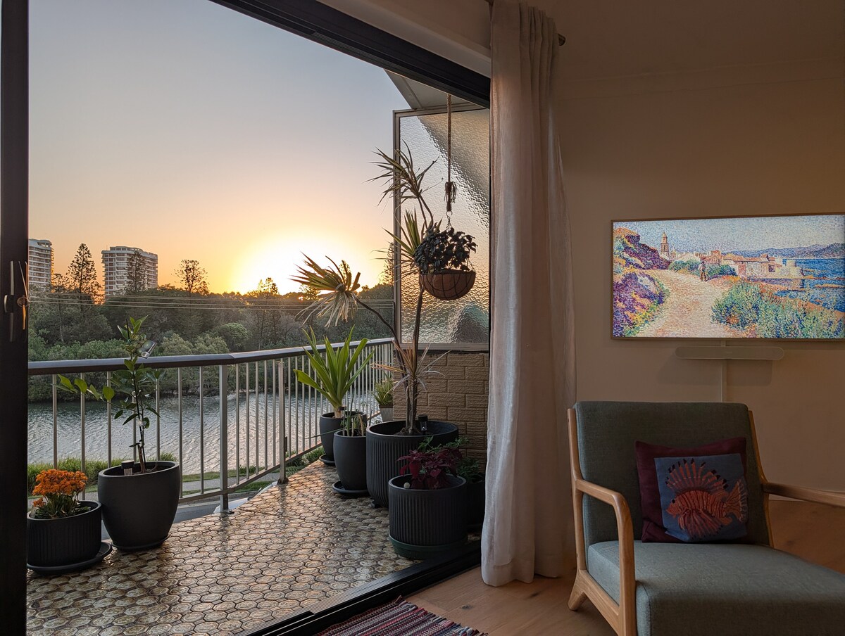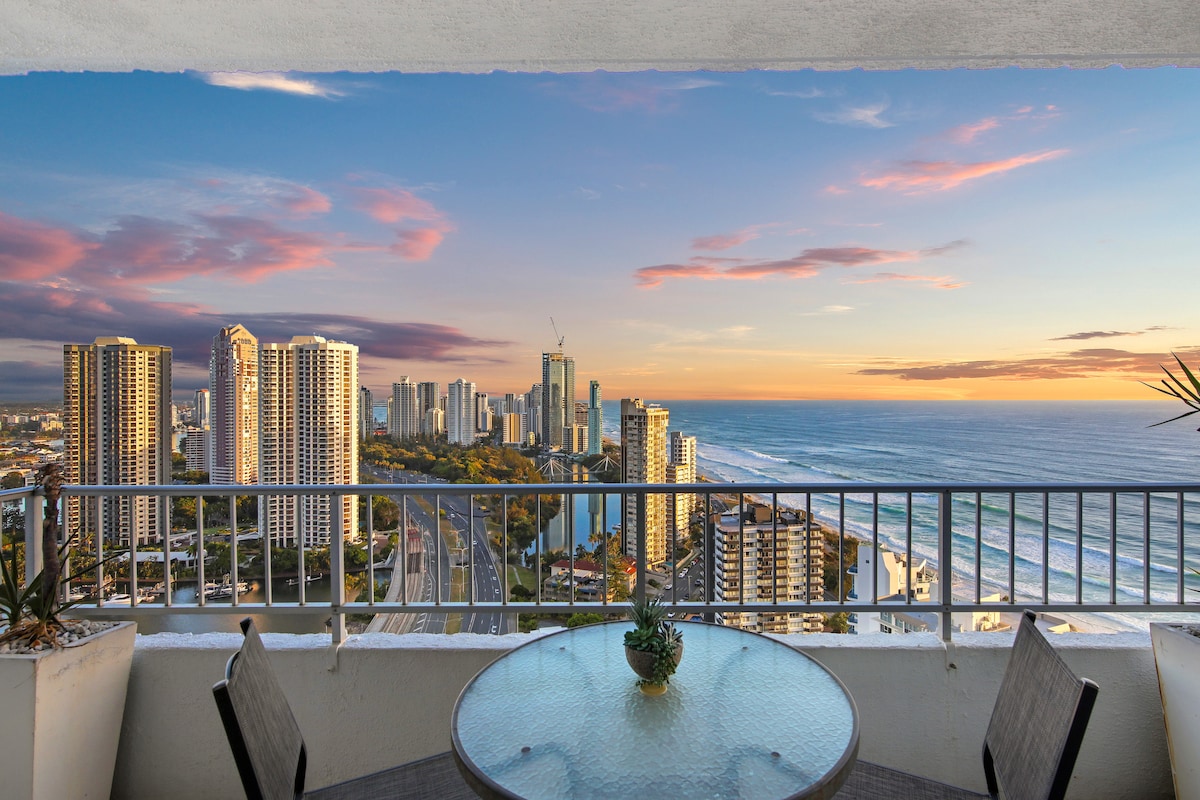 Bewundere die herrliche Aussicht der Eckwohnung mit Blick auf den glitzernden Ozean. Die Unterkunft befindet sich im fünften Stock, hoch genug, um den Strandblick zu genießen, niedrig genug, um das geschäftige Treiben auf der Straße zu genießen, 10 Gehminuten vom Unterhaltungsviertel Surfers Paradise, Märkten, Einkaufsmöglichkeiten, Restaurants und Clubs entfernt, gegenüber dem von Surfers Paradise patrouillierten Strand. Stadtbahnhof 8 Gehminuten entfernt. Die Wohnung verfügt über einen Smart-TV, verbinde dein Netflix, Apple TV usw.