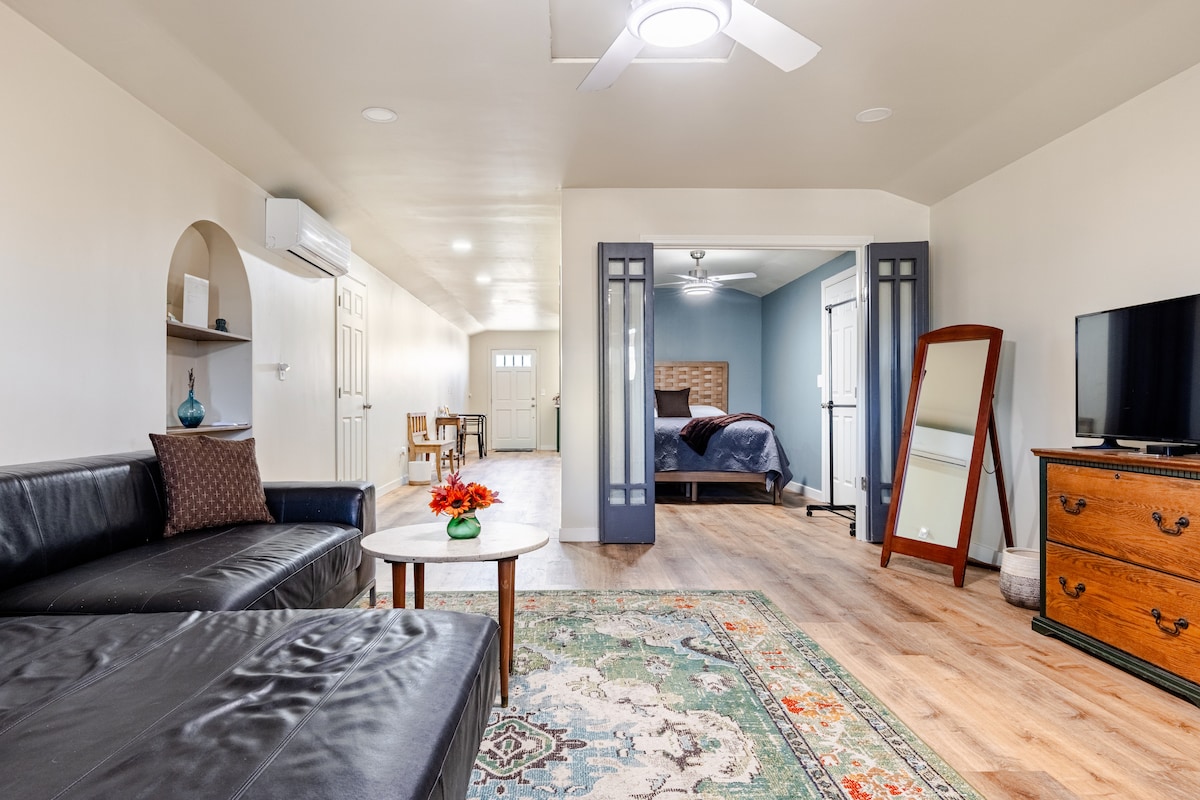 Genieße ein stilvolles Erlebnis in dieser zentral gelegenen Unterkunft. Die wunderschöne Casita ist eine komplett umgebaute Garage, die in ein Studio mit einem privaten Innenhof mit Lichterketten umgewandelt wurde, was sie zu einem perfekten kleinen Rückzugsort macht. Ganz gleich, ob du Alleinreisender, Paar oder Geschäftsmann bist, komm und entspann dich. Unser Haus liegt in einer ruhigen Gegend. UCR, CBU, RCC, Riverside Downtown, Historical Mission Inn und California School for the Deaf sind weniger als 5 Meilen entfernt.