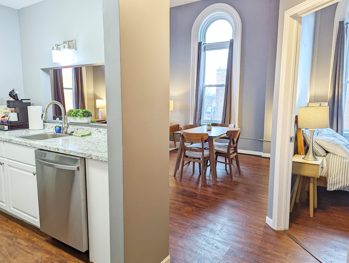 Geschichte und Komfort. Gönn dir einen fantastischen Aufenthalt in einer unserer Wohnungen im Erdgeschoss im Herzen des berühmten historischen Viertels Center Ave von Bay City. Ein Aufenthalt im The Weber wird wie kein anderer in deinem Leben sein. Die Schlafgelegenheiten umfassen zwei Schlafzimmer und eine bequeme, erstklassige Ausziehcouch, die sorgfältig vom führenden Hersteller Joybird gebaut wurde. Die Wohnungen verfügen außerdem über zwei voll ausgestattete Badezimmer, eine voll ausgestattete Küche, ein sonnendurchflutetes Esszimmer und ein schönes Solarium.