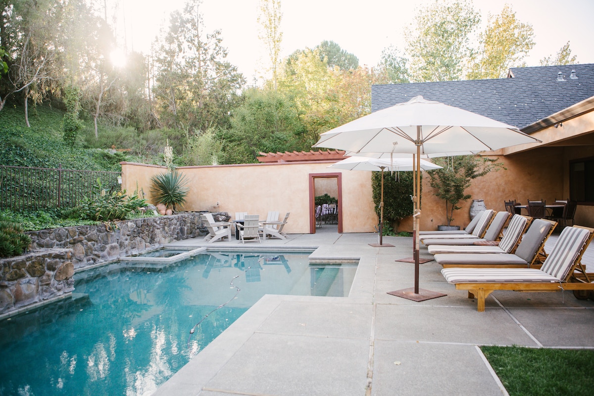 Lovely residential location, rustic glamping. Lounge by the pool or cuddle up by the electric fireplace. Surrounded by trees, birds singing, lovely views of the hills, you will feel at ease. Open the doors - it's an outdoor living/bedroom. NOTE only Outdoor Tiki Shower, very private/hot water. Parking on the street, well lit pathway/stairs to cabana. NO PARTIES. Only children over 12. Respect neighborhood, behave responsibly. Active security. Lite cooking, no oils please.