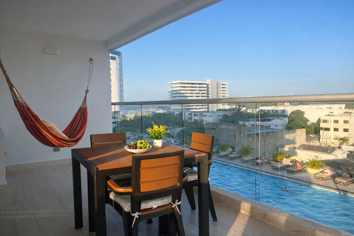 Exklusive Wohnung im 30. Stock in Morros City mit unglaublichem und fesselndem Blick auf das Meer und das historische Zentrum. Hauptschlafzimmer mit direktem Meerblick und Zugang zum Balkon. Voll ausgestattete Küche, 2-in-1-Waschmaschine und Trockner, 60-Zoll-Smart-TV, 500 MB Glasfaser-WLAN. Bocagrande am Strand mit luxuriösen Annehmlichkeiten: Pool, Whirlpool, Türkisches Bad und Fitnessraum. Kostenloser Parkplatz. Ideal für Paare, die das exklusivste Erlebnis von der höchsten verfügbaren Etage in ganz Cartagena suchen