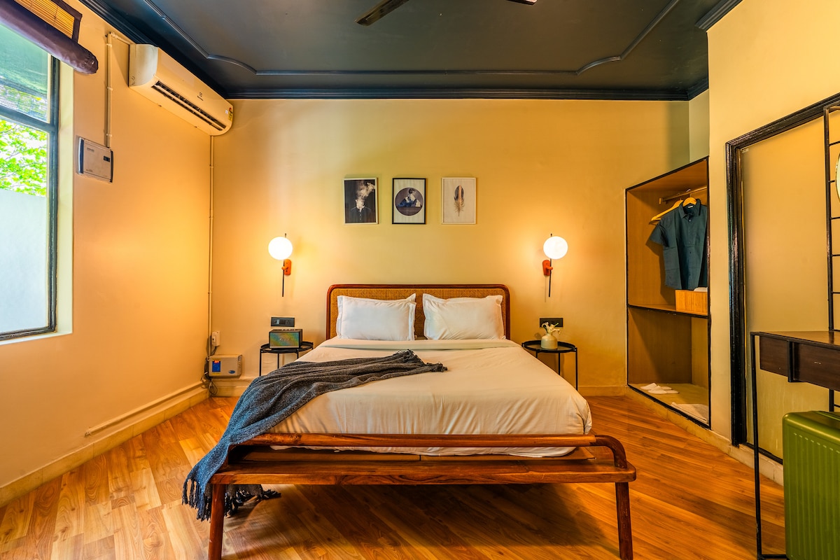 Eine Boho Chic Boutique in Hauz Khas Village - South Delhi Eine perfekte Mischung aus modernen Lebensstandards mit dem skandinavischen Design und der Atmosphäre. Unsere Luxe King Suite verfügt über einen entspannten Liegebereich, ein komfortables und gemütliches Kingsize-Bett, ein eigenes Badezimmer, einen Schreibtisch, ein Esszimmer, einen Schreibtisch mit Esszimmer und einen offenen Kleiderschrank. Ausstattung - Smart-TV, Minikühlschrank, Tee-/Kaffeemaschine, hochwertige Pflegeprodukte, kostenloses Frühstück und lokale Touren. Wir haben ein hauseigenes Café und eine Dachterrasse zum Chillen und Erholen.