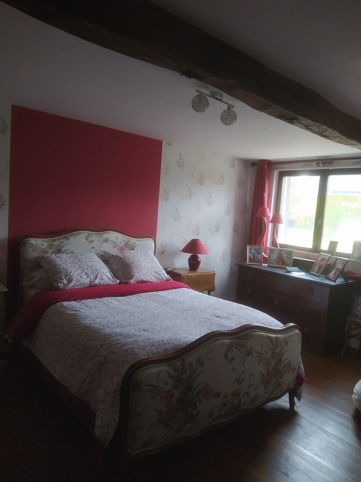 Chambre de 25 m2 spacieuse dans une longère normande en campagne. Lit de 2 personnes neuf et spacieux. Possibilité de fournir un lit et une baignoire pour bébé. La petite salle de bain avec douche et toilettes à proximité vous est réservée. Possibilité de petit déjeuner en supplément.