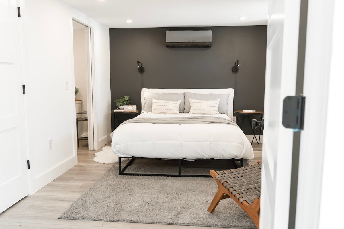 Das Hippie Pad wurde für entspannenden Komfort inspiriert und entworfen, der dich in die Ära der Blumenkinder für freigeistigen Spaß versetzt. Deine Suite im Erdgeschoss verfügt über eine gut ausgestattete Küchenzeile/Esszimmer, ein Queensize-Bett mit einem elektrischen Kamin – perfekt zum Kuscheln. Smart-TV hängt über dem Throwback-Stereo-Phonograph, WLAN-Verbindung verfügbar, Parkplätze vor Ort. Obwohl für Paare konzipiert, ist auf dem Schlafsofa ein zusätzlicher Schlafplatz vorhanden.