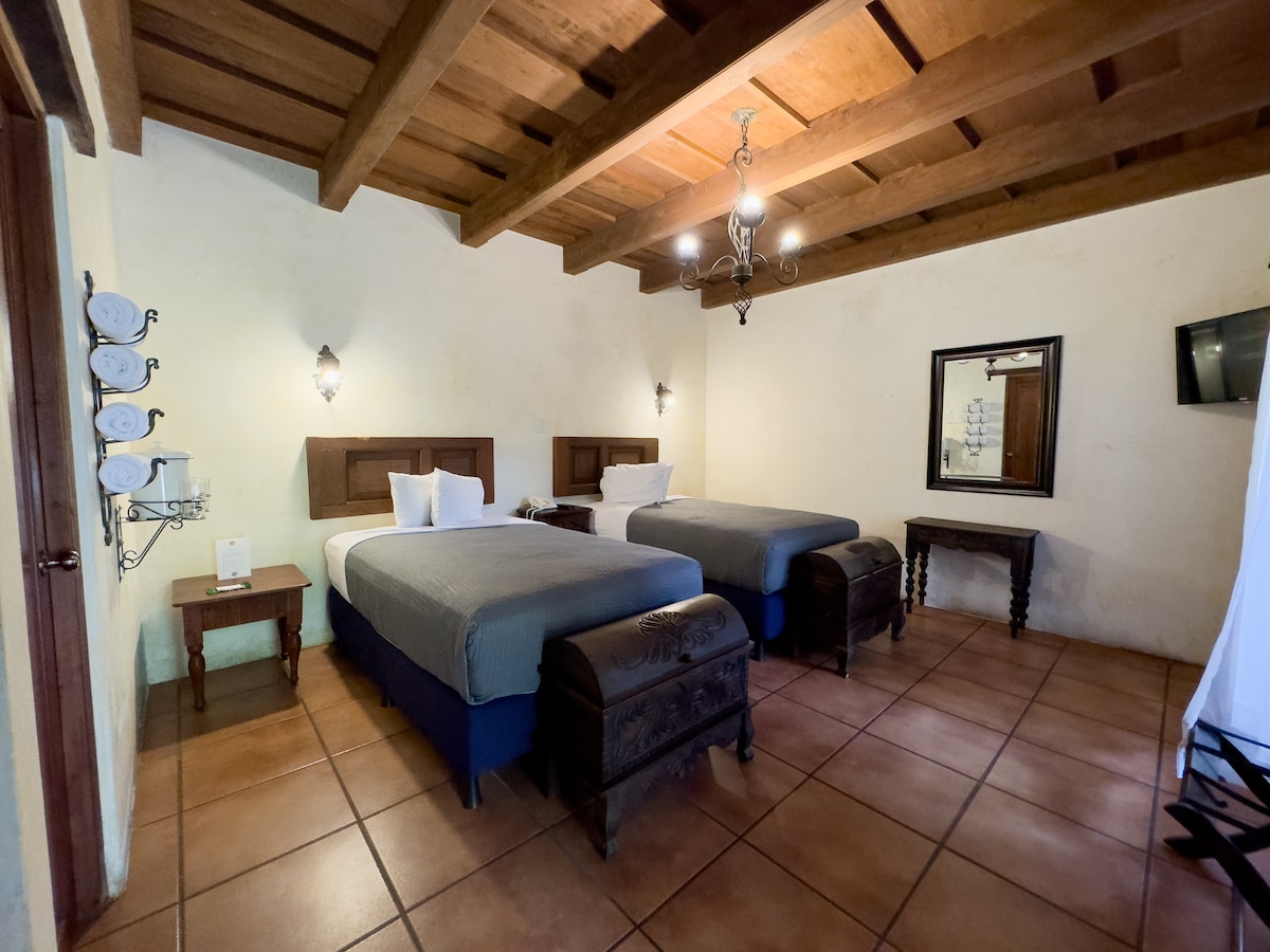 Gemütlich und funktional, ist dieses Zimmer perfekt für diejenigen, die einen komfortablen und gut gelegenen Raum suchen, um sich auszuruhen, nachdem sie Antigua erkundet haben. Sie verfügt über zwei Doppelbetten, ein eigenes Bad, Ventilatoren, Kabel-TV, einen Safe und eine Grundausstattung. Obwohl es kompakt ist, ist es sorgfältig ausgestattet, um dir einen ruhigen und problemlosen Aufenthalt zu ermöglichen. Ideal für Alleinreisende oder Paare, die Komfort, nahen Service und koloniale Atmosphäre schätzen.
