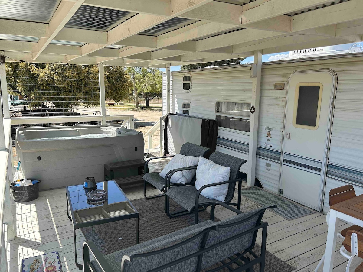 Der Whirlpool, die Klimaanlage und die Heizung sind alle funktionsfähig. Eine Million Sterne und keine Autos auf 4200’ Höhe. Übernachte in einem 25' renovierten Wohnwagen aus den 1990er Jahren mit Klimaanlage und einer 280 Quadratfuß großen überdachten Terrasse mit Misters und Ventilator, Propangrill und PRIVATEM WHIRLPOOL! Spezielle WLAN-Brücke sorgt für eine solide Anbindung. Frische Luft, keine Menschenmassen, schöne lokale Wanderwege. Lokale Weingüter und Restaurants sind lecker. WLAN ist großartig. Fernseher mit Roku drinnen; Bluetooth-Lautsprecher auf der Terrasse und Kühe auf der Weide. Es ist ein ruhiger Rückzugsort!