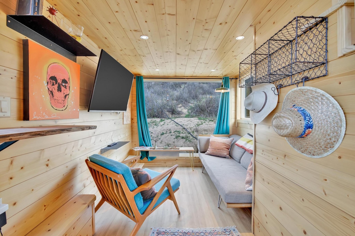 Das Rambler liegt versteckt inmitten von Felsbrocken in der Hochwüste mit atemberaubendem Blick auf die Hügel und Berge dahinter. Mit 12' hohen Decken und durchdachtem Layout bietet dieses winzige Haus 2 Schlafbereiche (Queen/Twin), offenes Wohnkonzept + Küche, Badezimmer mit Komposttoilette und eine 10' Theke, die perfekt positioniert ist, um die friedliche Landschaft zu genießen. Dies ist gepaart mit einer geräumigen Terrasse, einem Grill und einer Sauna. Tritt weg. Verbinde dich wieder. Entdecke eine andere Art, Dinge zu tun. Willkommen im The Rambler.
