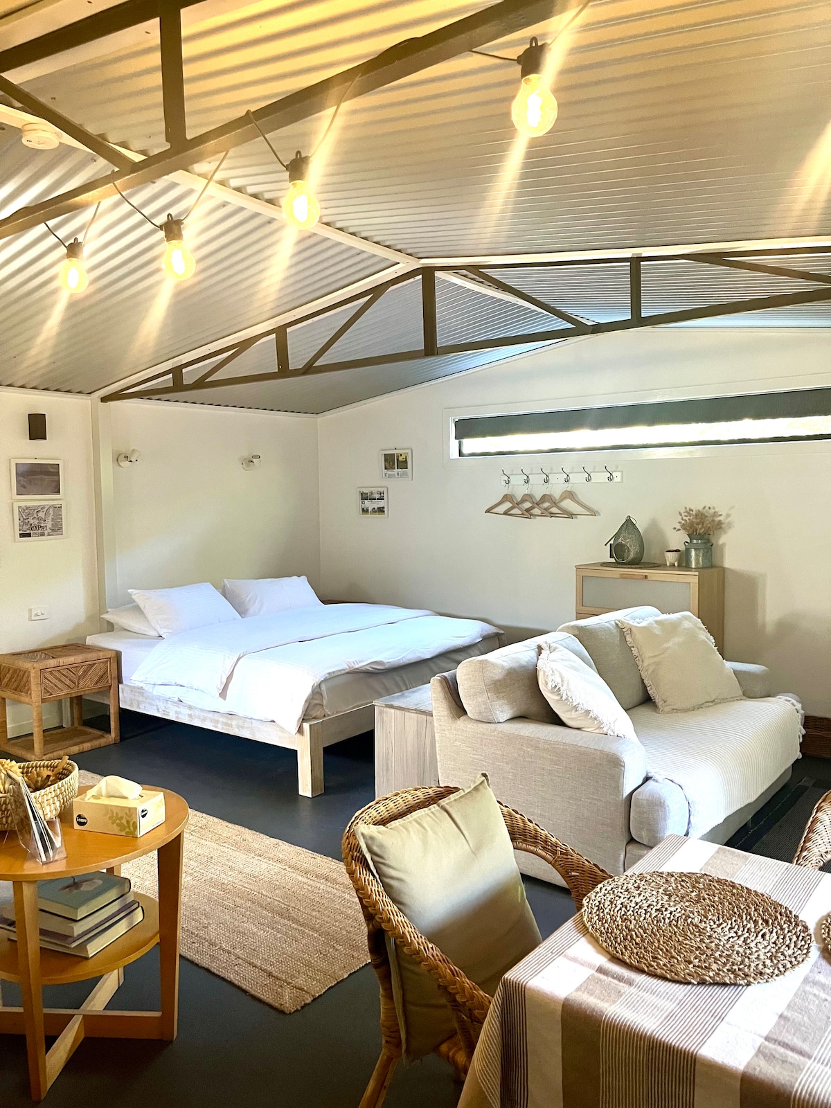 Deine private und gemütliche Unterkunft erwartet dich. Entspanne dich zwischen den Bäumen, Sträuchern und Vögeln, teile die faszinierende Wärme um ein Feuer und genieße eine abgeschiedene Außendusche, während du in den Sternenhimmel blickst. Im Inneren wirst du von einem kompletten Holzinterieur, üppigen Pflanzen, malerischer Keramik und bequemen Möbeln begrüßt. Die 2 Schlafzimmer umfassen ein gemütliches Queensize-Bett und 1 Satz Einzeletagenbetten mit Kleiderschränken. Die Kombüsen-Küchenzeile verfügt über grundlegende Annehmlichkeiten wie eine Mikrowelle, einen Kühlschrank und einen Grill im Freien.