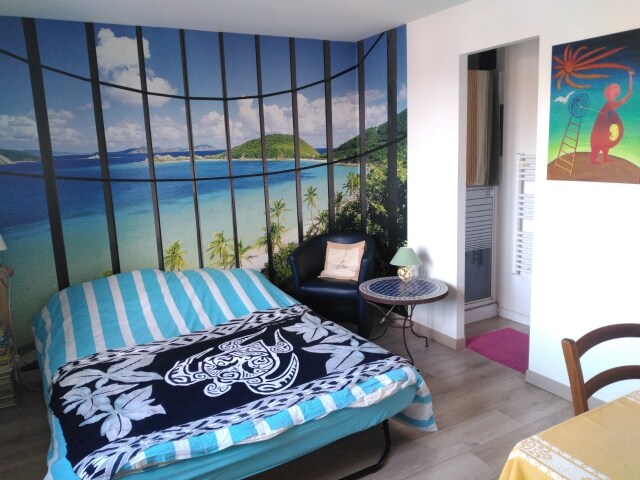 Venez vous ressourcer dans ce T1 35m² tout neuf , classé meublé 4* avec cuisine ouverte équipée, chambre avec TV et salle de douche, climatisation reversible et machine à laver. Convertible dans le salon. Terrasse extérieure 25m² équipée d'une plancha, salon et bains de soleil. Arrivée à partir de 16h avec accueil (au-delà d'une certaine heure l'arrivée se fera via un code pour récupérer les clefs). Possibilité de rentrer les vélos dans les communs.