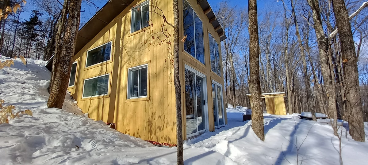 Unser nordisches Waldchalet ist perfekt geeignet, um Zeit zu zweit (oder mit einem Kind) oder für ein Work-Retreat (mit Highspeed-WLAN) zu verbringen. Das Holzinterieur ist warm und gemütlich. Die Fenster in voller Höhe bieten einen atemberaubenden Blick über ein bewaldetes Tal. Die offene Küche und das Wohnzimmer halten dich beim Kochen im Gespräch. Wenn du lieber draußen kochen möchtest, gibt es eine Feuerschale mit Grill und Esstisch im Freien. Nur 70 Fahrminuten von Montreal entfernt. Der See ist 25 Gehminuten entfernt, wenn du in der Nähe parkst.