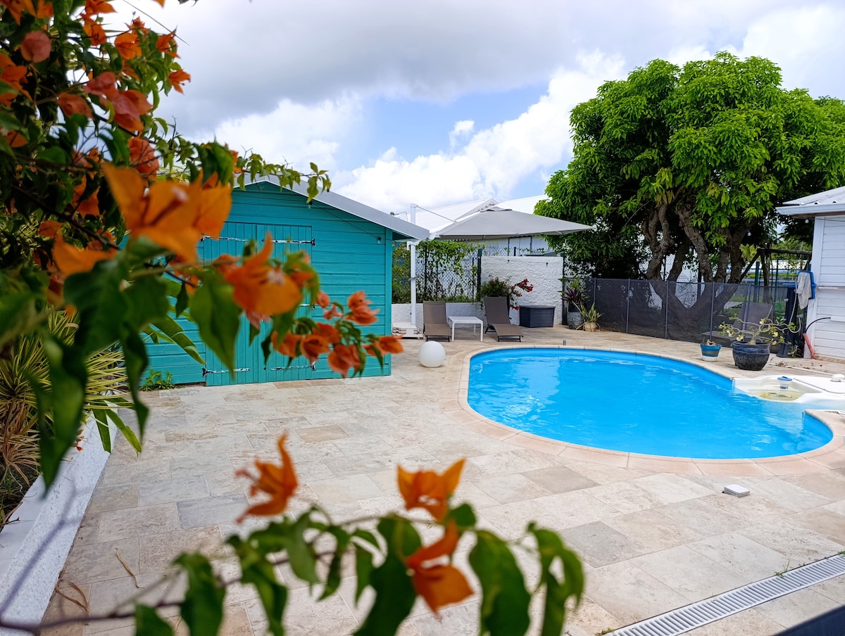 Entspanne dich in dieser einzigartigen und ruhigen Unterkunft. Diese Wohnung befindet sich im Erdgeschoss einer hübschen tropischen Villa in Petit Bourg, ideal für Reisen in Guadeloupe, wo man in Jarry arbeiten kann. Die schöne schattige Terrasse verfügt über eine Außenlounge, Tische, Stühle für deine Mahlzeiten und eine gut ausgestattete Bar-Küche. Genieße einen schönen 8 x 3 m großen Swimmingpool zum Entspannen. Auf der Schlafseite befinden sich zwei Schlafzimmer mit einem 140 cm großen Bett und einem Gemeinschaftsbad. Herzlich willkommen!