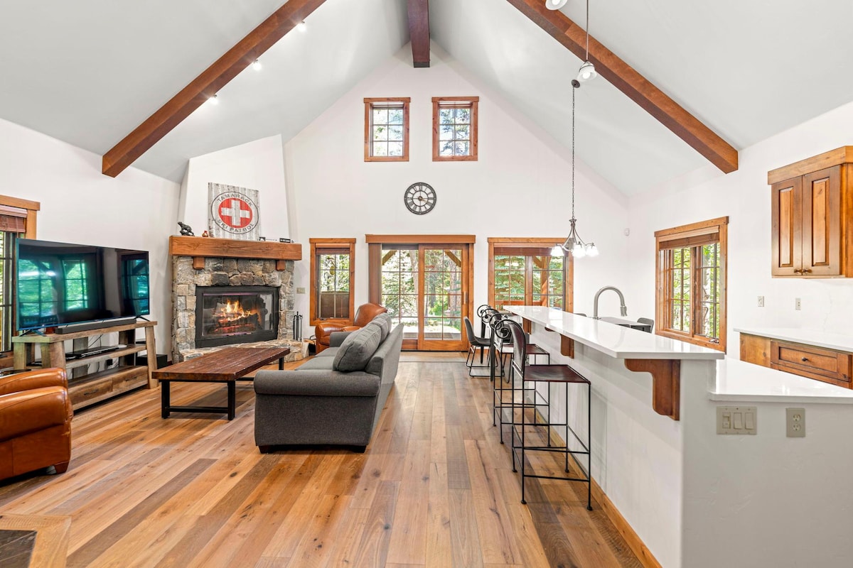 Fantastische Lage mit Zugang zum Skilift von POMA! Dieses Chalet im Sawtooth-Stil ist voller Wärme und rustikaler Bergcharme; es bietet 1.800 Quadratfuß Fläche in einem offenen Grundriss, der sich ideal für die Unterhaltung von Familie und Freunden eignet. Die Küche ist komplett mit allem Geschirr und Utensilien ausgestattet, das du zum Kochen benötigst, mit großen Geräten, Granit-Arbeitsplatten und einem offenen Konzept, das sich perfekt für Unterhaltung eignet. Tritt nach draußen auf die große umlaufende Veranda und feuere den Grill an, wenn der Fre