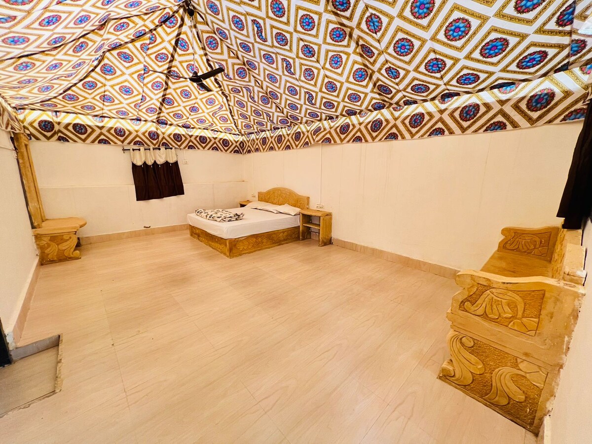 Willkommen in Jaisalmer! Das Zelt hier ist eines, das dich bei deiner Ankunft begeistern wird. Es befindet sich eine Autostunde von der Stadt Jaisalmer entfernt und verfügt über grundlegende Annehmlichkeiten. Da die Lage mitten in der Wüste von Thar liegt, ist die Umgebung etwas, das jeder für jeden schätzt! Die Gebühr hier beinhaltet die Abholung und Rücktransport vom Bahnhof/Busstand, sodass du dir keine Sorgen um deine Reise machen musst! Viel Spaß beim Touren! Gute Touren!