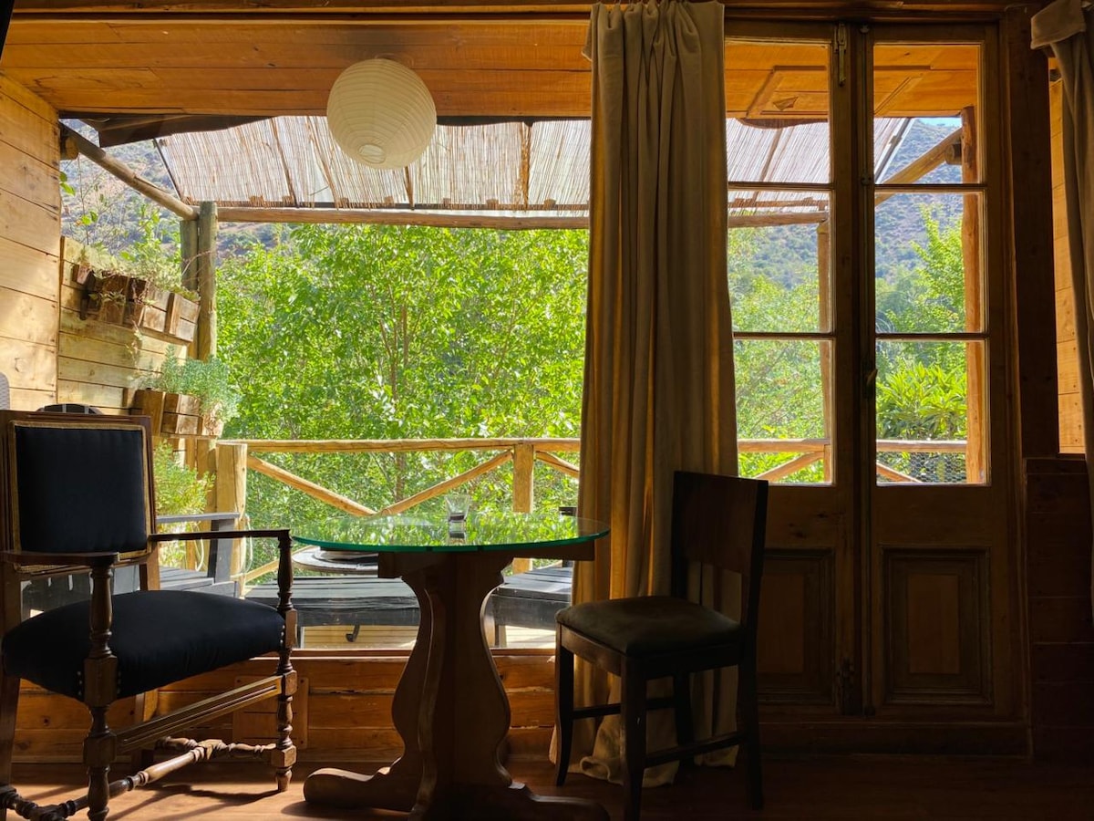 Kleines rustikales Ferienhaus, ohne Küche, mit Grill auf der Terrasse. Zwischen großen Bäumen, Meter vom Fluss Maipo mit exklusivem Zugang zum Ferienhaus entfernt. Es verfügt über eine Terrasse und einen privaten Parkplatz. Ideale Unterkunft für Paare und Abenteurer, Tinaja mit heißem Wasser auf der Terrasse, um sich mit dem Rauschen des Flusses unter einem Sternenhimmel zu entspannen. Die Tinaja ist für den privaten Gebrauch und ohne Zeitpläne.