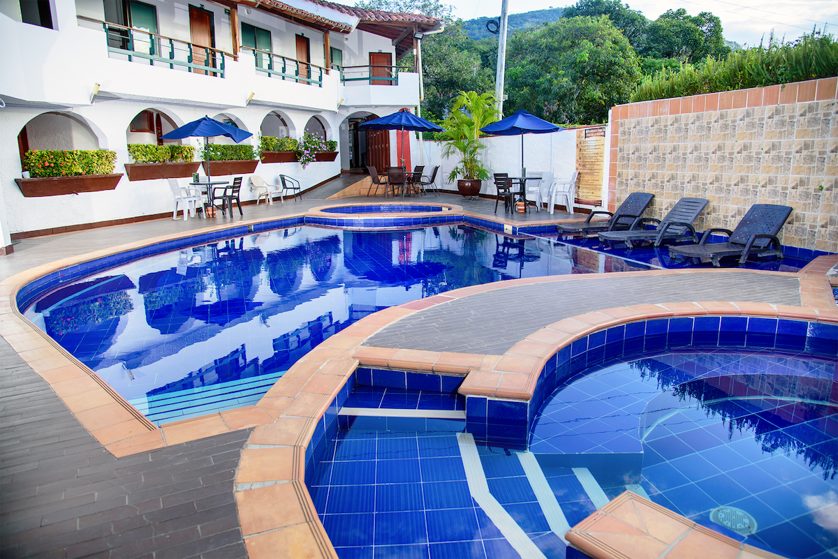 Somos un Hotel campestre con todas las comodidades, recepción las 24 horas, zonas verdes, piscina mediana, 4 jacuzzis, baño turco, parqueadero y wifi,, todo incluido en la tarifa. Estamos a las afueras de San Gil, saliendo 1 kilometro por la vía hacia Bucaramanga. Tenemos restaurante donde tendrán delicioso desayuno Santandereano incluido y platos a la carta hasta las 8:30 p.m. Estamos en una parte alta, tranquila y llena de naturaleza, todo el establecimiento tiene vista a la montaña.