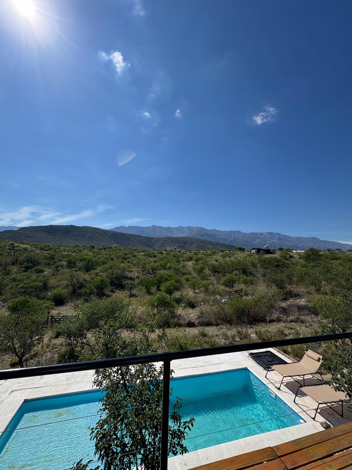 Dieses Haus in den Bergen von Cordobesas ist ein geräumiger und ruhiger Ort, ideal für Familie oder Freunde. Es wurde von seinen Eigentümern mit einem nicht-traditionellen und ökologischen System gebaut. Sie hat einen einheimischen Stil mit breiten Wänden, Holz- und Eisenschreinerei und grünem Dach. Die breiten Wände und die Struktur der freiliegenden Baumstämme bilden einzigartige Details. Die große Galerie ist von Obstbäumen und einheimischen Bergen umgeben. Vom weitläufigen Pool aus kannst du die Aussicht auf die Bergketten genießen.
