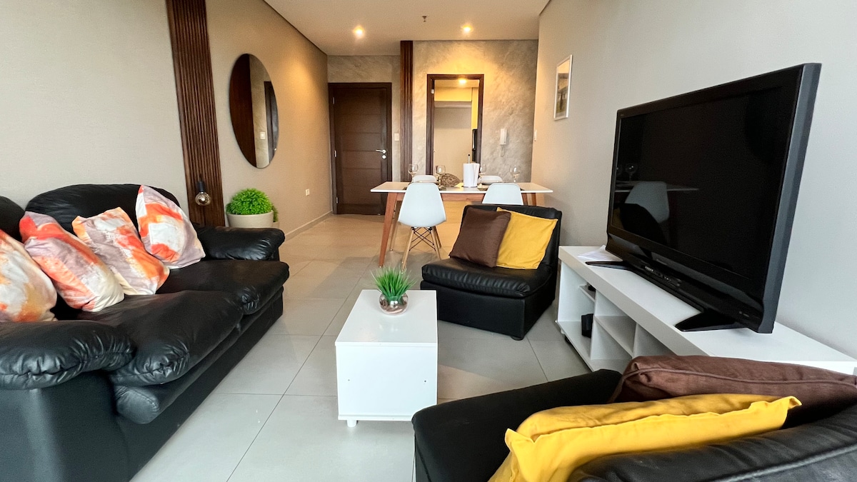 Departamento súper equipado en zona residencial, con balcón y parrilla, hermosa vista y amenities premium: - Piscina con solarium - Piscina climatizada - Sauna - Gym en altura - Rooftop + Quincho - Laundry - Seguridad 24hs - Cochera Excelente ubicación: - A 7 minutos del Eje Corporativo, Shopping del Sol y Paseo La Galería - A 10 minutos de la Costanera y el Puente Héroes del Chaco - A 15 minutos del Aeropuerto Silvio Pettirossi Cuenta con Wi-Fi, Smart TVs y colchones firmes de alta densidad