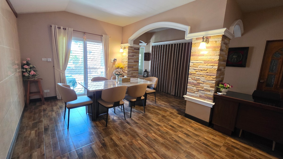 ABOUT THIS PLACE 2 Large Bedrooms Comfortable beds with air conditioning 2 Bathrooms Equipped with water heaters and full amenities Living Room Cozy seating with a large sofa and TV • Kitchen Fully equipped kitchen with an electric stove, refrigerator, and dining table • Spacious Garden Front yard with a lawn, safe for children to play • Private Parking Accommodates several cars • Located in a peaceful and secure neighborhood • Close to 7-Eleven Just a short walk for convenient shopping