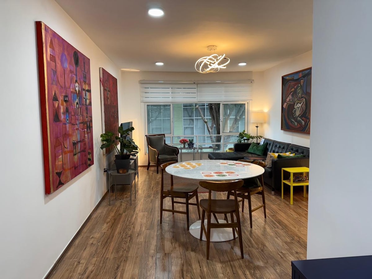 Genieße eine zentrale, helle und elegante Wohnung, perfekt für Erholung oder Arbeit. Mit 200 MB WLAN und Zugang zum gemeinsamen Fitnessraum und zur Dachterrasse, ideal zum Trainieren, Lesen, Essen oder Entspannen im Freien unter der Sonne. Lokale Mischung. In einem legendären Viertel von Mexiko-Stadt gelegen, das für seine Architektur, Kultur und Gastronomie bekannt ist. Zu Fuß erreichbar zu: - 1 km Denkmal für die Revolution - 1,5 km Engel der Unabhängigkeit - 2,5 km Roma - 3 km Condesa - 3,5 km zum historischen Zentrum.