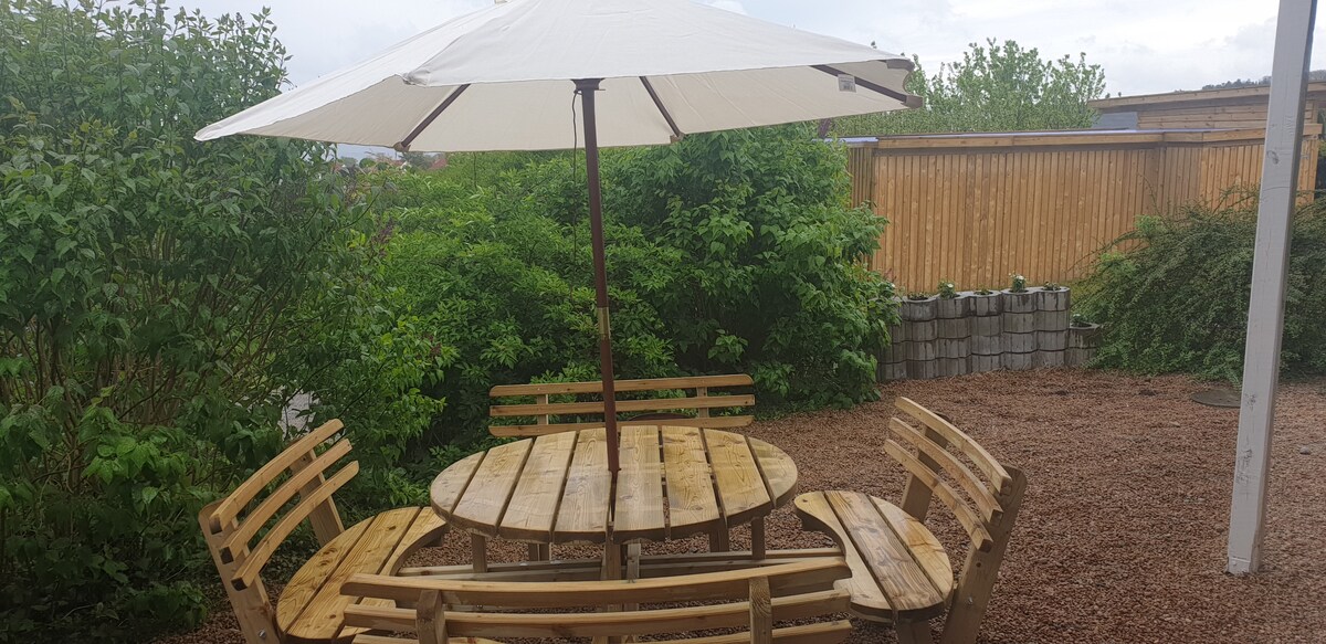 Genießen Sie die Ruhe im gemütlichen Gästehaus, das inmitten einer malerischen Umgebung mit Blick auf das Meer von der Wiese liegt, wo Sie sich in unserem Sinnesgarten entspannen können. Wir haben uns entschieden, ein hohes Bett mit Stufen zu bauen, so dass man beim Liegen und Hinausschauen einen Blick über die Wiese hat. Für ältere Menschen kann es etwas schwierig sein, das Bett zu erreichen.