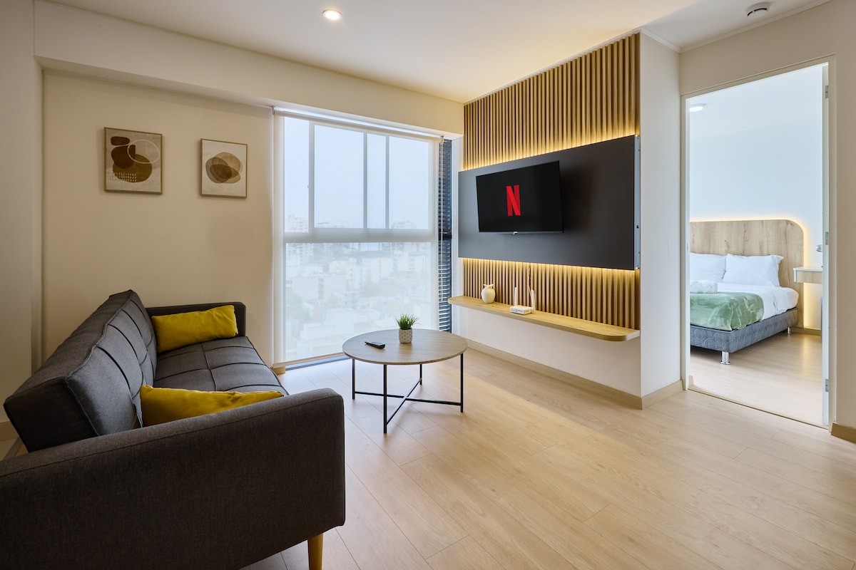 Erwachen Sie mit Skyline-Blick in diesem hellen Boutique-Loft in Miraflores, Limas sicherstem und fußgängerfreundlichstem Viertel. Panoramafenster, kuratiertes Design und ein heller Balkon schaffen eine moderne, ruhige Atmosphäre. Zugang zu Rooftop-Pool, Fitnessraum, Coworking und Parkplatz. Suite-Schlafzimmer plus zweites Zimmer mit Schreibtisch, ultraschnelles WLAN, 24/7-Rezeption und Self-Check-in, nur eine halbe Straße vom Kennedy Park entfernt.