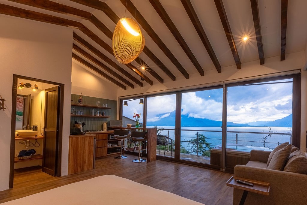 Wake up in your king-sized bed to one of the most amazing views in the world. Enjoy a swim “beneath” the volcanoes and hang out on the dock. Relax and enjoy the tranquility or get out and explore. Take a walk to one of the neighboring villages or explore the lake by boat. At the end of the day settle back with a glass of wine as you watch the sunset.