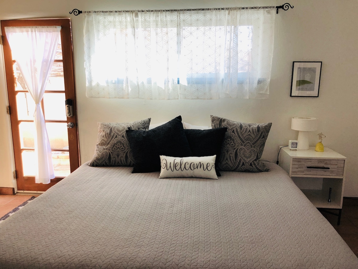 Willkommen in Santa Fe! Dieses charmante Studio-Ferienhaus und mein Zuhause teilen sich das Grundstück in dieser ruhigen Wohngegend. Das Ferienhaus ist voller Santa-Fe-Charme mit einem gemütlichen, hübschen Interieur, Oberlichtern und viel natürlichem Licht, einer voll ausgestatteten Küchenecke, handgefertigten Schränken, mexikanischen Fliesen, einem bequemen Queensize-Bett und einer privaten Gartenterrasse. Es ist ein ruhiger Hafen, aber zentral gelegen, nur 2 Meilen von der Plaza/Innenstadt entfernt. Es ist ein schöner Ort für Paare, Solo-Abenteurer und Geschäftsreisende.