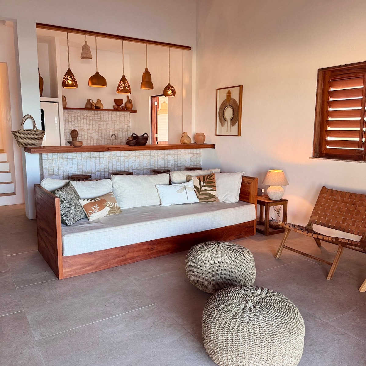 Entspannen Sie sich in einem Chalet, das weniger als 150 m vom Strand von Taibinha entfernt ist. Schlafen Sie ruhig und hören Sie das Rauschen des Meeres, aber in der Kühle der Klimaanlage und tanken Sie neue Energie, denn hier gibt es jeden Tag Wellen, es gibt Lagunen zum Segeln, Quad-Touren, Höhlen und paradiesische Strände! Das Doppelbett befindet sich im Zwischengeschoss des Chalets mit Meerblick 🏝️☀️ Wir haben eine voll ausgestattete Küche mit Kühlschrank, Herd und Zubehör. Es gibt auch die Dachterrasse (gemeinsam mit den anderen Chalets) mit Panoramablick auf den Strand.