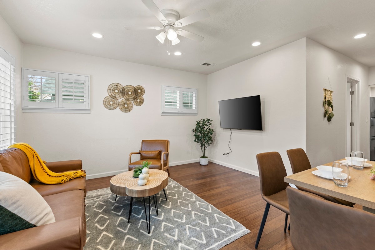 Unser freistehendes Gästehaus liegt zentral in DTSJ in der Nähe von Japantown und verfügt über ein Kingsize-Bett, das extrem komfortabel ist, und eine Klimaanlage vom Typ „Mini Split“ im Schlafzimmer, die eine erholsame Nachtruhe garantiert. Eine voll ausgestattete Küche für Köche und für diejenigen, die während ihres Aufenthalts arbeiten müssen, ein automatisches ergonomisches Sitz-Steh-Pult. Die Oase im Freien verfügt über einen riesigen 65-Zoll-Smart-TV, eine stimmungsvolle Beleuchtung, einen Außendeckenventilator, eine Propangrillstelle sowie einen Ess- und Loungebereich. Das Parken auf der Straße ist kostenlos und reichlich vorhanden.